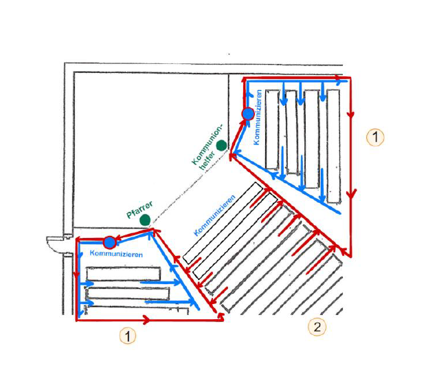 Zuerst gehen die Gläubigen der beiden Wandblöcke von den ersten Bänken nach Vorne, empfangen vom Priester oder Kommunionhelfer die hl. Kommunion auf die ausgestreckte Hand, kommunizieren das Hl. Brot und gehen dann an der jeweiligen Wand zurück!