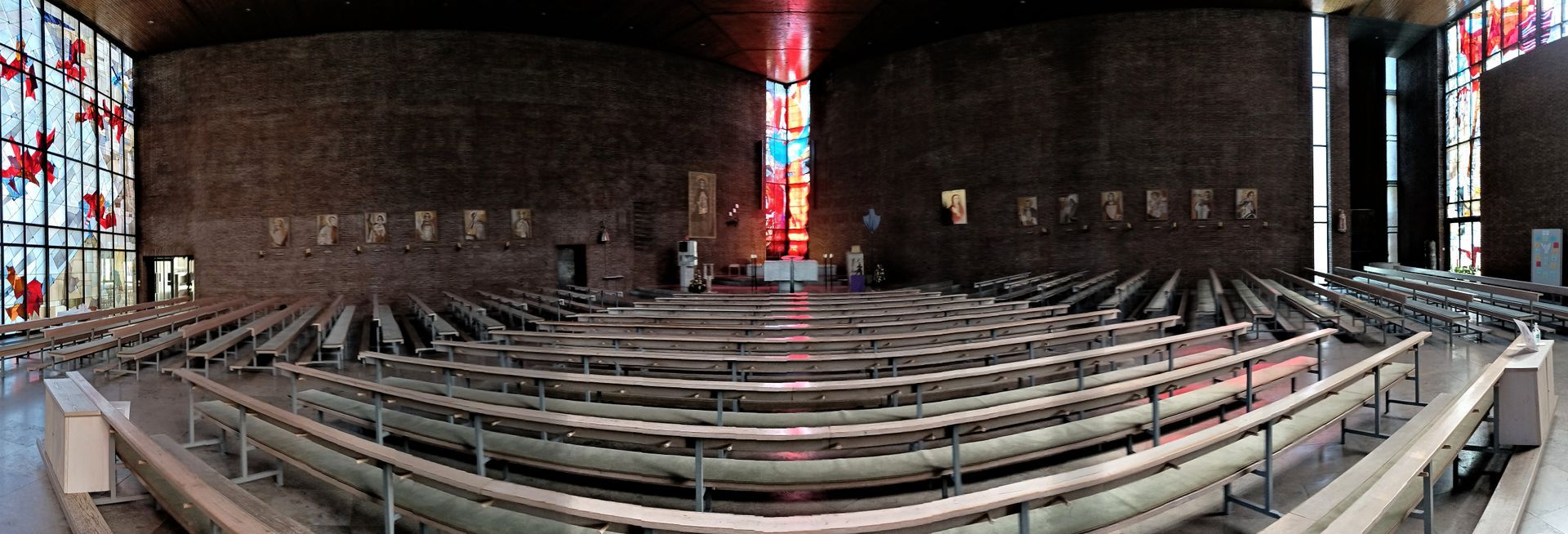 Der Diözesanbaudirektor Hans Schädel, Würzburg, baute die St. Piuskirche in Haunstetten 1961-65 auf einem quadratischen Grundriss. Im Inneren bilden die Ziegelwände eine Diagonalachse. Am einem Ende der Achse der Altar, am anderen die Orgel, die Bänke in Kreissegmenten um den Altar geführt. Solche Anlagen nützen den vorhandenen Platz zur höchsten Sitzplatzzahl aus. Sie bringen aber den Nachteil, dass der Altar in ein Eck abgedrängt scheint und der Priester sich von den rings andringenden Gläubigen eingesperrt fühlt. Deshalb wird der Grundriss in dieser Form kaum mehr verwendet. Es gibt aber - nach Ruhstorf bei Passau - eine solche Ecklösung, die keine Enge schafft. Sie findet sich in St. Pius, Haunstetten wieder. Der Grund: Diözesanbaudirektor Hans Schädel hat ein Eck hinter den Altar geschlitzt und hat ein 9,25 m hohes und 3,62 m breites Fenster über Eck eingefügt. Damit öffnete er den Raum hinter dem Altar.
