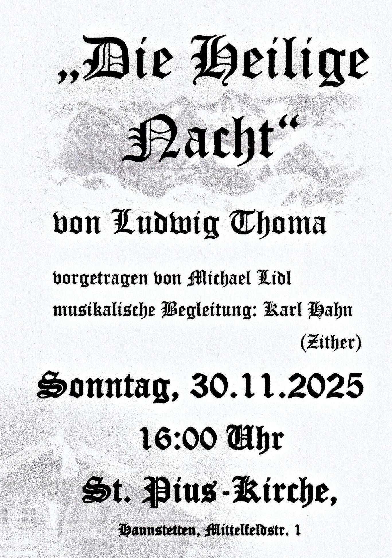 Am Adventssonntag, 30.11.2025 um 16:00 Uhr wird „die Heilige Nacht“ von Ludwig Thoma mit musikalischer Begleitung in unserer Kirche vorgetragen. Vorher laden wir Sie zum Begegnungs-nachmittag nicht nur für Senioren ab 14:30 Uhr zur adventlichen Kaffeestunde ins Pfarrzentrum ein.